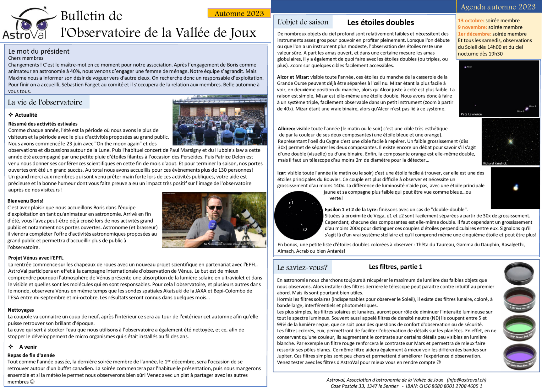 Vous constaterez qu’il y a des nouveautés au niveau du personnel, certaines déjà en place, d’autres à venir. Mais il y a toujours des projets, des collaborations scientifiques, des observations et des rendez-vous pour profiter du ciel tous ensemble à l’observatoire.