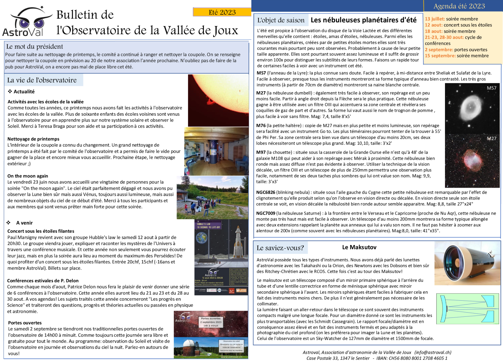 L’été est la période la plus active à l’observatoire. De nombreuses activités sont organisées, que ce soit pour les membres ou pour le grand public. Vous retrouverez cette actualité dans notre lettre d’information. Au programme: concert, conférences, étoiles filantes, portes ouvertes, etc…
